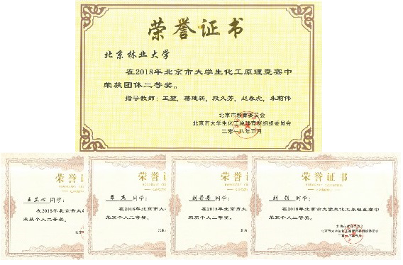 经过初赛和决赛,2015级林产化工专业刘丹丹、刘硕,林产化工专业(制浆造纸工程方向)覃杰和梁希班(林化方向)王兰心获得个人二等奖;赵宁、胡英菡、周紫荆等6人获得个人三等奖。
