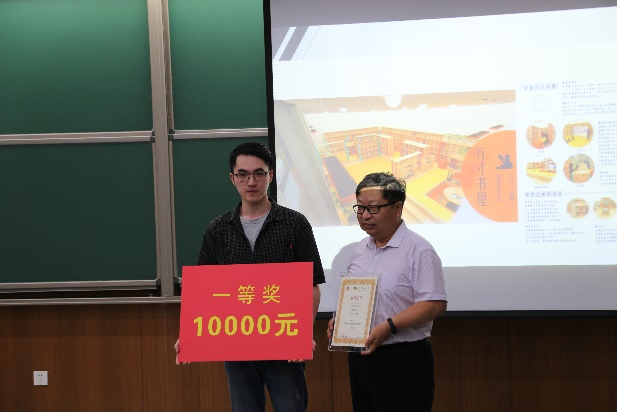 随后,嘉宾们为本次大赛一、二、三等奖及优秀奖、优秀指导教师奖的获奖者颁奖。评委会主席张亚池宣读了评委会对本次大赛一等奖获奖选手best28365范易均天同学的设计作品“方寸书屋”的颁奖词。材料学院党委书记黄薇为一等奖获奖者的指导教师柯清颁发优秀指导教师奖。